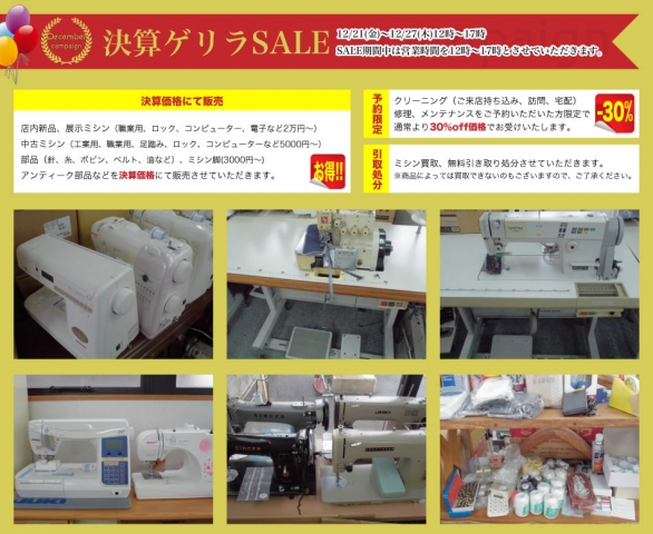 ①店内新品、展示ミシン(職業用、ロック、コンピューター、電子など2万円~)、中古ミシン(工業用、職業用、足踏み、ロック、コンピューターなど5000円~)、部品(針、糸、ボビン、ベルト、油など)、ミシン脚(3000円~)、アンティーク部品などを決算価格にて販売させていただきます。