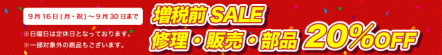 コジマミシン修理センターより期間限定でお得な増税前SALEのお知らせです!! 【9月16日(月・祝)~9月末まで】 修理・販売・部品が20%OFFとなりますので、是非この機会にご利用くださいませ。 ※日曜日は定休日となっております。 ※一部対象外の商品もございます。